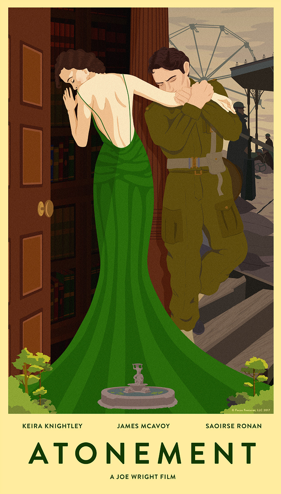 Gicleé print made for Gallery 1988's 2017 'Focus Features 20th Anniversary' Show. To celebrate all the films Focus Features have created over the years I chose to depict one of my favourite films of theirs; 'Atonement'. The colours, the cinematography, the costumes are so iconic. I drew strong influence from the painting 'Hellelil and Hildebrand, the meeting on the turret stairs' by Frederic William Burton. The hidden romance between the soldier and the high born lady was the perfect way to illustrate Cecelia & Robbie's love affair.