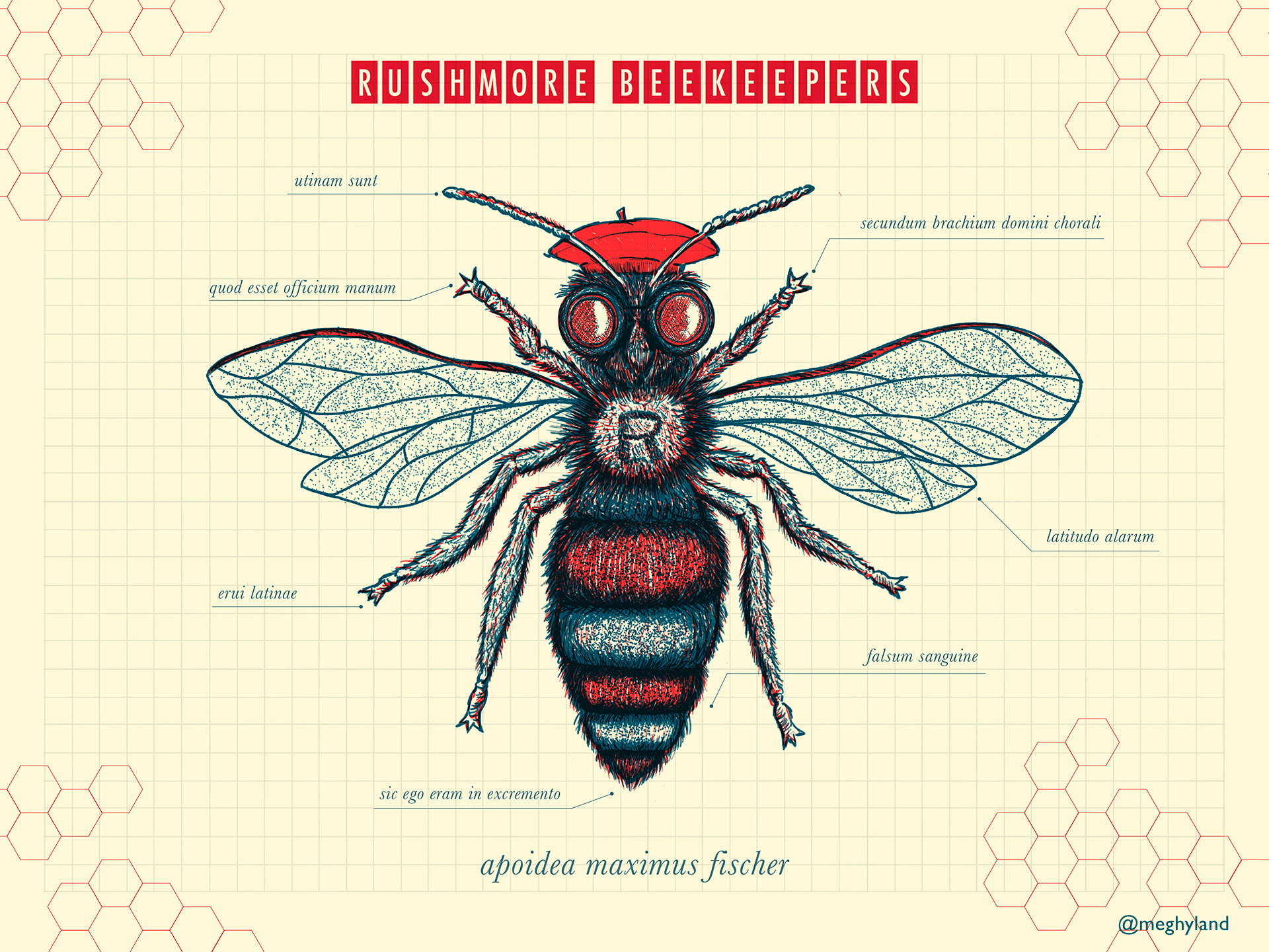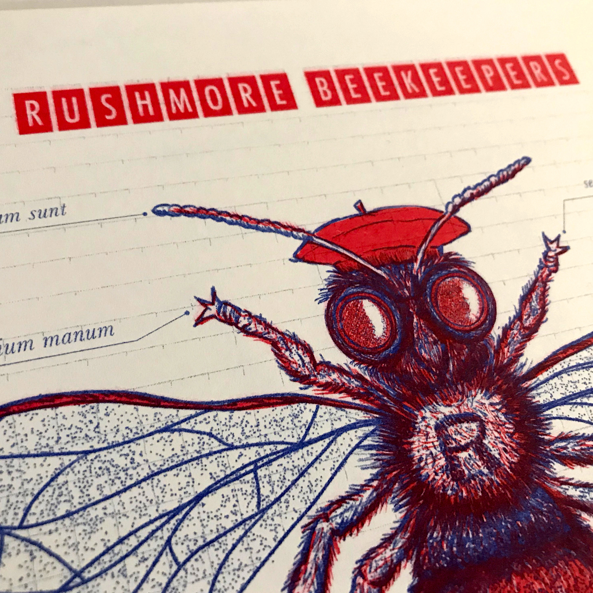 Chockfull of references form Wes Anderson's cult hit Rushmore, this two colour risograph features a very special bee, the 'Apoidea Maximus Fischer' harking back to Rushmore's hero Max Fischer and his love of the Rushmore Beekeeper's club. Each bit of latin reveals a different reference to to film.